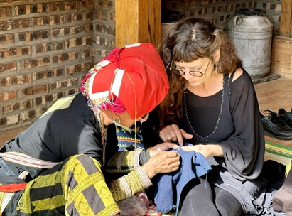 Preserving and promoting the quintessence of brocade embroidery is also a way for Sa Pa to introduce its rich tourism image to domestic and foreign tourists. In the photo: Foreign visitors learn about the patterns and brocade embroidery of Red Dao women.