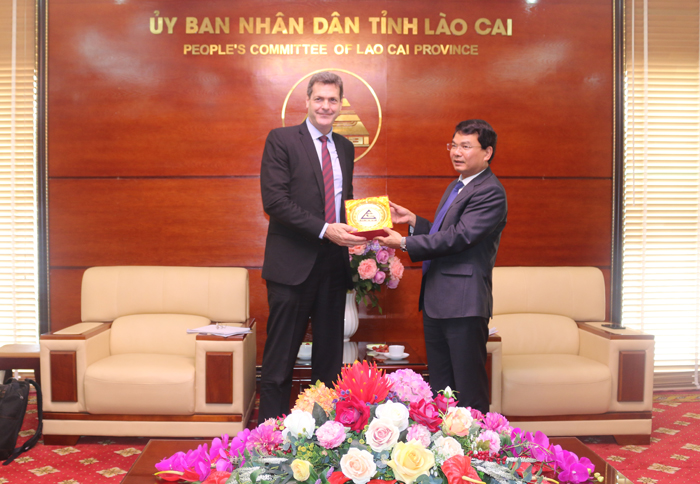 Bí thư Tỉnh ủy Lào Cai tặng quà lưu niệm cho Giám đốc quốc gia Andrew Jeffries