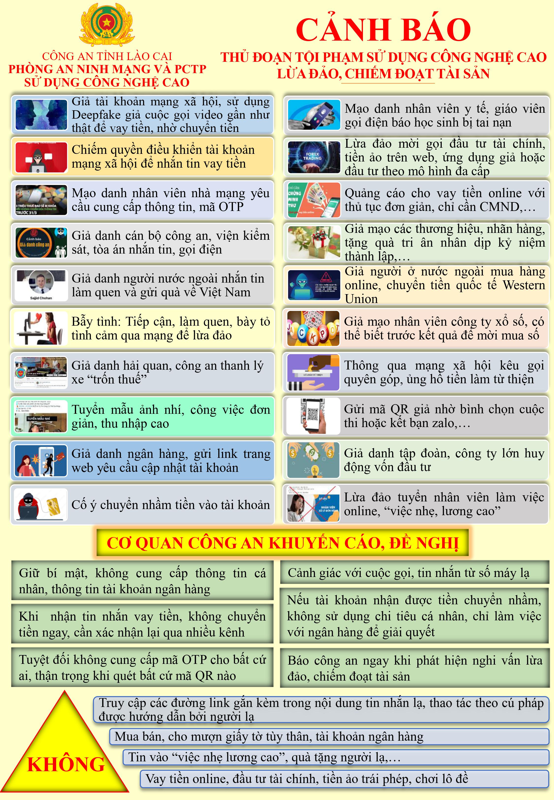 Trước thực tế đó, các cơ quan chức năng đã vào cuộc nhằm tuyên truyền nâng cao tinh thần cảnh giác, kỹ năng phòng ngừa các chiêu trò lừa đảo trên không gian mạng cho Nhân dân. Sở Thông tin và Truyền thông đã có văn bản gửi các sở, ban, ngành, đoàn thể tỉnh; Ủy ban nhân dân các huyện, thị xã, thành phố; các cơ quan báo chí trên địa bàn tỉnh; Cổng thông tin điện tử tỉnh Lào Cai và các cổng thành phần đề nghị đẩy mạnh tuyên truyền phòng chống lừa đảo trực tuyến. Công an tỉnh và công an các huyện, thị xã, thành phố đã triển khai hoạt động tuyên truyền về phòng chống lừa đảo trên không gian mạng tới các cơ sở và người dân. Trang thông tin điện tử của Công an tỉnh Lào Cai (https://congan.laocai.gov.vn/) tăng cường các tin bài tuyên truyền trong chuyên mục “Cảnh báo tội phạm”.