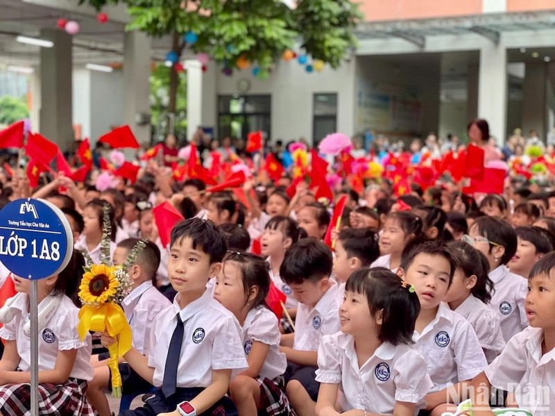 Học sinh lớp 1 Trường tiểu học Chu Văn An (Tây Hồ, Hà Nội) trong lễ khai giảng sáng 5/9. (Ảnh: DUY LONG)