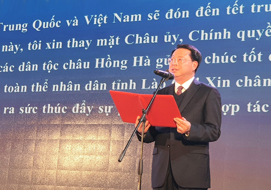 Hôm nay tại thành phố Lào Cai xinh đẹp, hòa bình, mến khách; trong không khí tươi vui, nồng ấm, quý vị đại biểu, du khách và Nhân dân hai nước sẽ cùng thưởng thức những tiết mục văn nghệ đặc sắc, mang đậm giá trị văn hóa dân tộc được thể hiện bởi các nghệ sỹ, diễn viên đến từ tỉnh Lào Cai và châu Hồng Hà. Những bài ca, vũ điệu là lời chào Xuân 2024 rộn ràng, rực rỡ; Nhân dân hai bên biên giới cùng nhau bắc thêm những nhịp cầu hữu nghị để vun đắp mối tình thắm thiết Việt - Trung; láng giềng tốt, bạn bè tốt, đồng chí tốt, đối tác tốt; thúc đẩy vững chắc việc xây dựng cộng đồng chia sẻ tương lai Việt Nam - Trung Quốc.