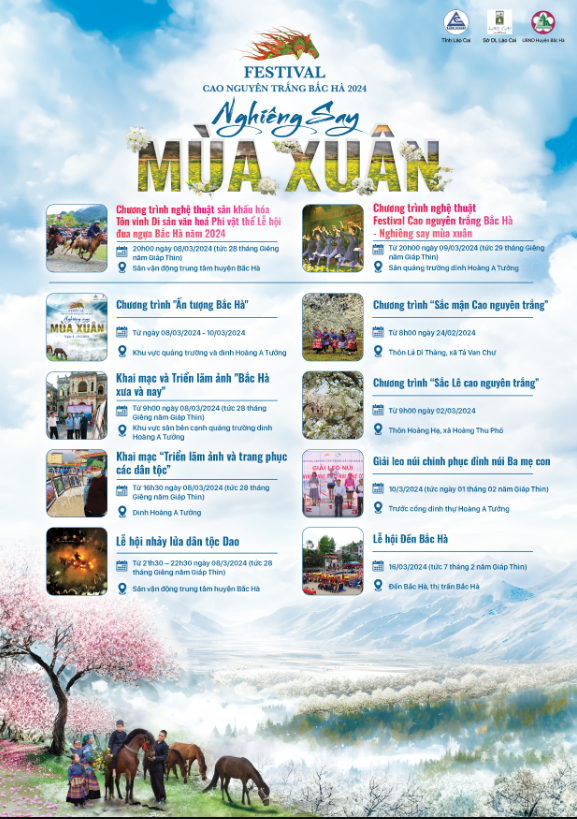 Theo Ban Tổ chức, Festival Cao nguyên trắng Bắc Hà với chủ đề “Nghiêng say mùa Xuân” năm 2024 sẽ diễn ra từ ngày 8/3/2024 đến ngày 10/3/2024 với nhiều hoạt động đặc sắc, hấp dẫn.