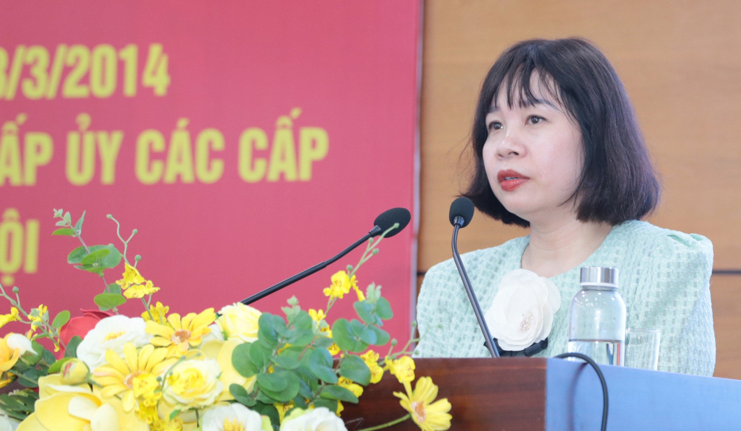 Đồng chí Từ Thúy Quỳnh, Phó Viện trưởng Viện Dư luận xã hội phát biểu tại hội nghị.
