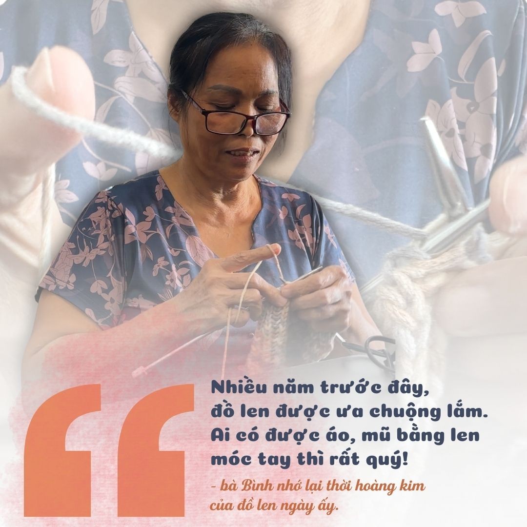 Thành viên cao tuổi nhất trong xưởng là bà Nguyễn Thị Bình, ở phường Kim Tân, thành phố Lào Cai. Năm nay 62 tuổi. Bà Bình là giáo viên về hưu. Từ khi còn trẻ, bà đã đam mê móc len, bà tự học và sáng tạo nhiều cách móc để tạo ra được những chiếc áo, mũ, khăn theo ý thích.