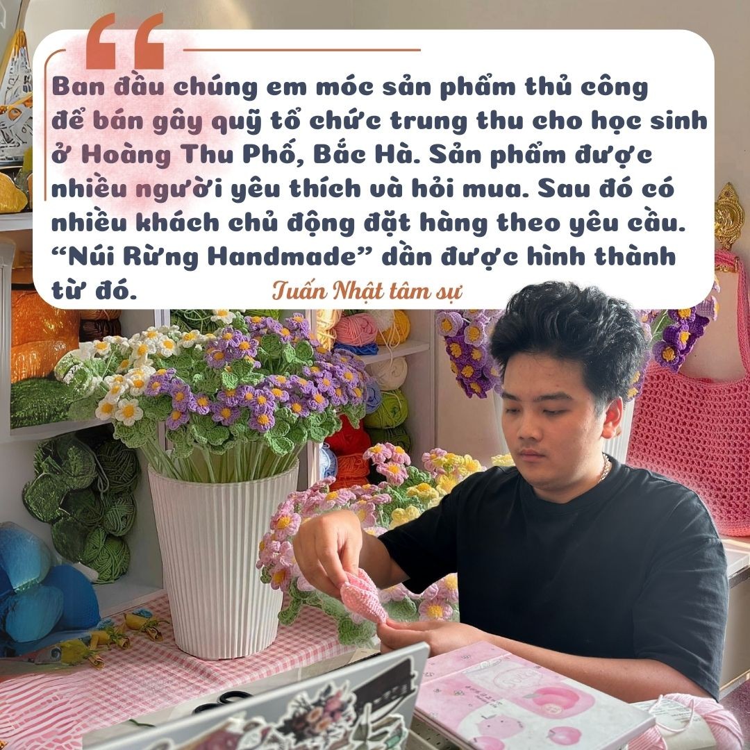 Ngay từ khi thành lập xưởng, Tuấn Nhật mong muốn giới thiệu, quảng bá sản phẩm len và nghề móc len truyền thống đến thị trường khách quốc tế. “Em là người Tày, sinh ra và lớn lên ở miền núi nên rất mong muốn sản phẩm khởi nghiệp của mình có thể gắn liền với núi, rừng, quê hương và vươn ra thị trường quốc tế. Đó cũng là lý do em đặt tên xưởng len là Núi Rừng Handmade” - Tuấn Nhật tâm sự.