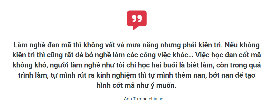 Theo anh Trường, mỗi ngày, cả công chẻ nan, anh đan được khoảng 10 bộ cốt ngựa, trừ chi phí tiền mua nứa, cũng cho thu nhập 350 nghìn đồng/ngày, mỗi tháng đều đặn trên dưới 10 triệu đồng. Việc chẻ nan để đan cốt mã, theo kinh nghiệm của anh Trường, chẻ bằng máy sẽ không đan được, vì chẻ tay sẽ lựa được nan cật, khi đan dễ uốn hơn, cũng sẽ tạo hình mã đẹp hơn… Chính vì thế, gia đình anh Trường chị Hiền mua nứa của bà con ở bản Bông và một số bản lân cận, buổi tối tranh thủ chẻ nan trước, còn ban ngày thì đan. Công đoạn đan một bộ cốt mã mất khoảng 50 phút. Khó nhất là tạo hình từ phần ngực đến đầu, sao cho dáng mã khi đứng lên, thể hiện sự dũng mãnh, vẻ oai phong của ngựa thần.