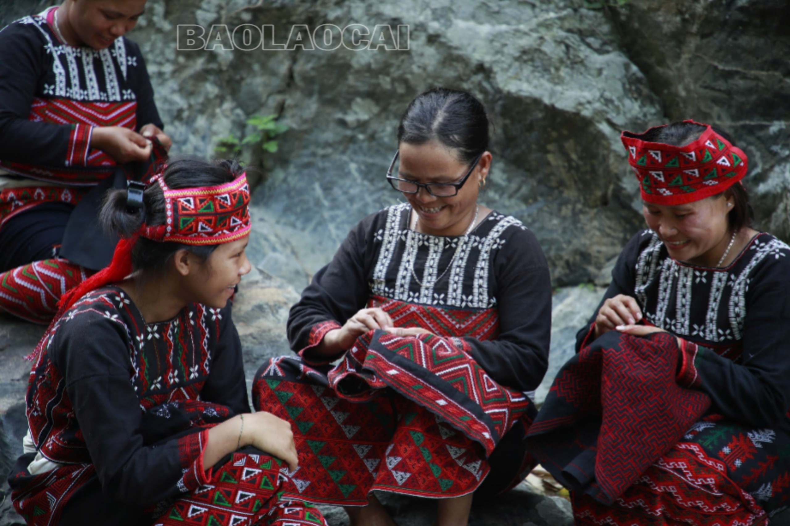 Phụ nữ Xá Phó ở Hợp Thành giữ nghề thêu trang phục truyền thống.