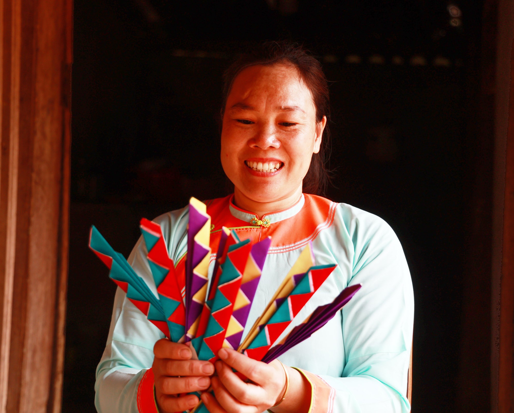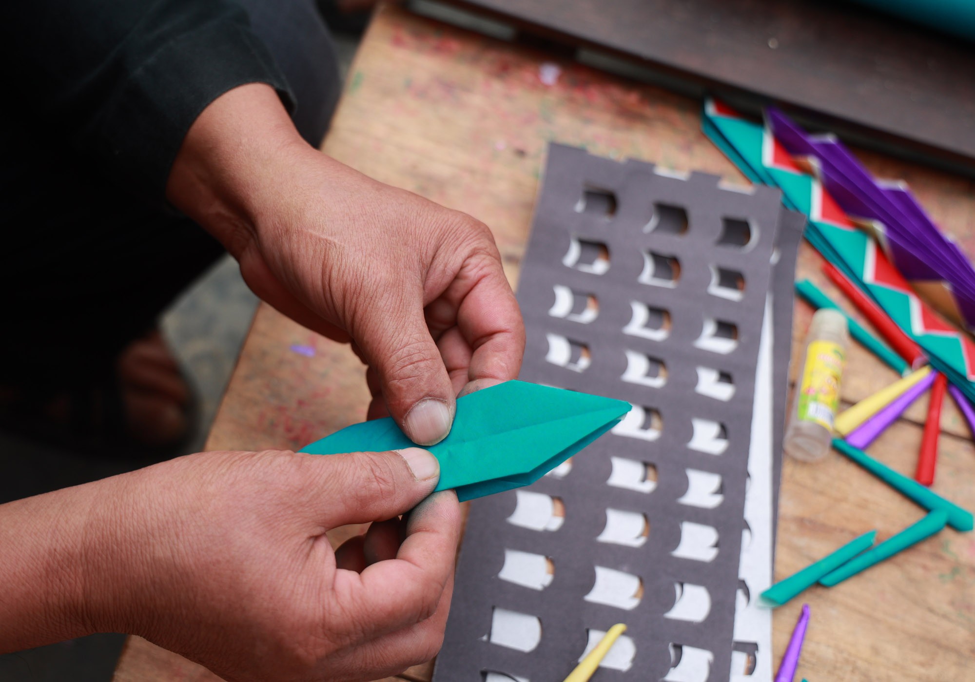 Gấp hoa văn bằng giấy màu để trang trí cho nhà táng.