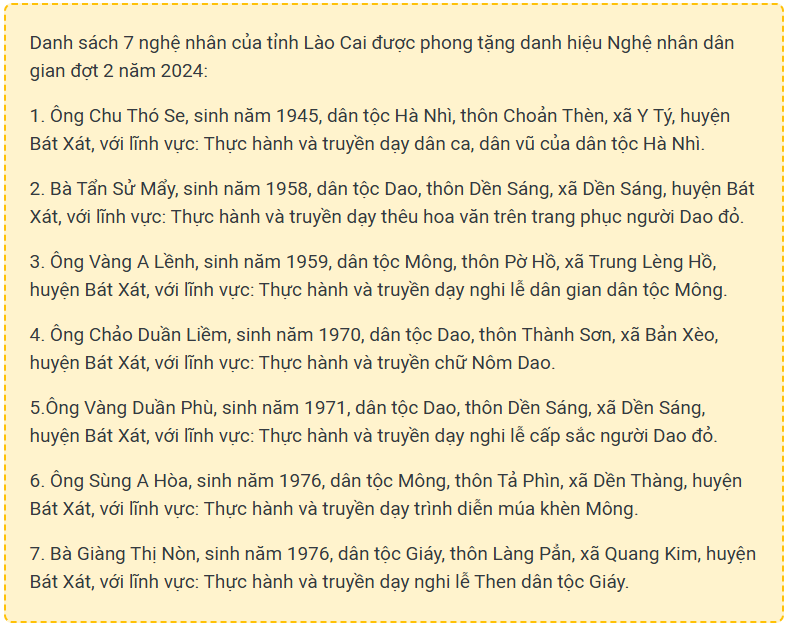 Trong đợt phong tặng lần này, tỉnh Lào Cai vinh dự có 7 nghệ nhân được Chủ tịch Hội Văn nghệ Dân gian Việt Nam phong tặng danh hiệu Nghệ nhân dân gian.