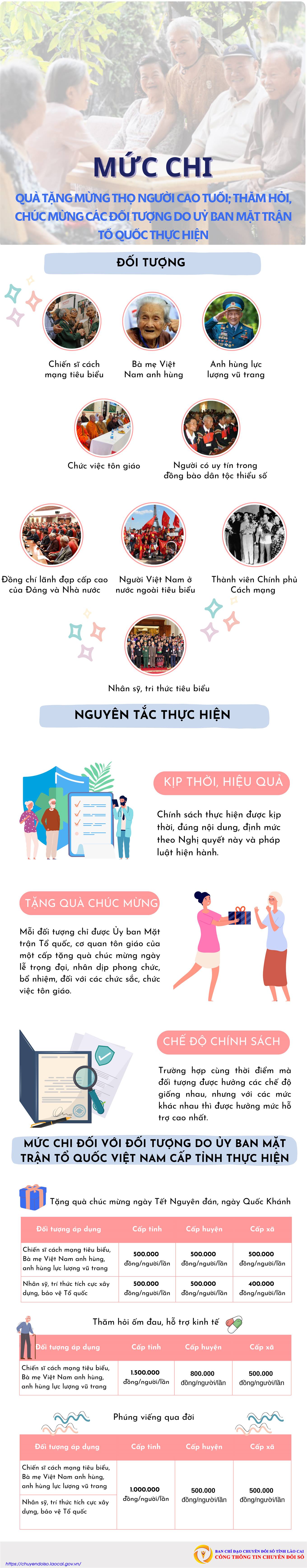 Ngày 06/12/2024, Hội đồng nhân dân tỉnh Lào Cai đã ban hành Nghị quyết số 29/2024/NQ-HĐND sửa đổi, bổ sung một số điều của Nghị quyết số 69/2016/NQ-HĐND ngày 18/7/2016 của Hội đồng nhân dân tỉnh Lào Cai về một số mức chi quà tặng chúc thọ, mừng thọ người cao tuổi; đón tiếp, thăm hỏi, chúc mừng các đối tượng do Ủy ban Mặt trận Tổ quốc, cơ quan dân tộc, cơ quan tôn giáo thực hiện.