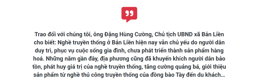 Tuy vậy, để người Tày ở Bản Liền phát triển kinh tế bền vững từ nghề thủ công truyền thống vẫn là bài toán đang cần lời giải. Thiết nghĩ, địa phương cần có định hướng bảo tồn nghề truyền thống mang tính dài hơi, thiết kế mẫu mã sản phẩm phù hợp với thị hiếu người tiêu dùng có sự kết hợp giữa truyền thống và hiện đại, mang tính ứng dụng cao; đồng thời cũng cần có những chính sách hỗ trợ, thúc đẩy phát triển nghề thủ công truyền thống để phục vụ địa phương phát triển kinh tế du lịch hiệu quả.