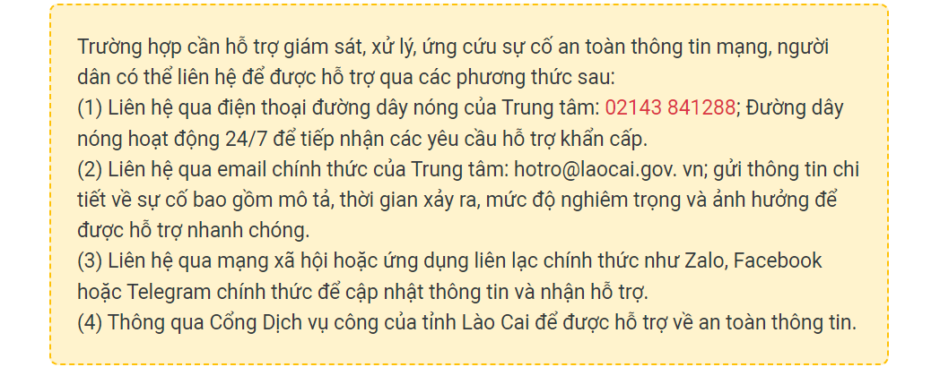Ông Nguyễn Hồng Quang, Phó Giám đốc Sở Thông tin và Truyền thông tỉnh Lào Cai cho biết: Thời gian gần đây, tình hình an toàn thông tin diễn biến phức tạp, với nhiều thủ đoạn tấn công, xâm nhập, đánh cắp thông tin ngày càng tinh vi và số lượng gia tăng. Đáng lưu ý, số lượng các cuộc tấn công mạng cũng như mức độ nguy hiểm thường diễn ra vào các sự kiện lớn và dịp nghỉ lễ. Do đó, để đảm bảo an toàn thông tin trong dịp Tết Nguyên đán Ất Tỵ và lễ kỷ niệm 95 năm thành lập Đảng Cộng sản Việt Nam, Sở Thông tin và Truyền thông đã ban hành hướng dẫn các cơ quan, đơn vị, địa phương phối hợp, tăng cường thực hiện các biện pháp đảm bảo an toàn thông tin.