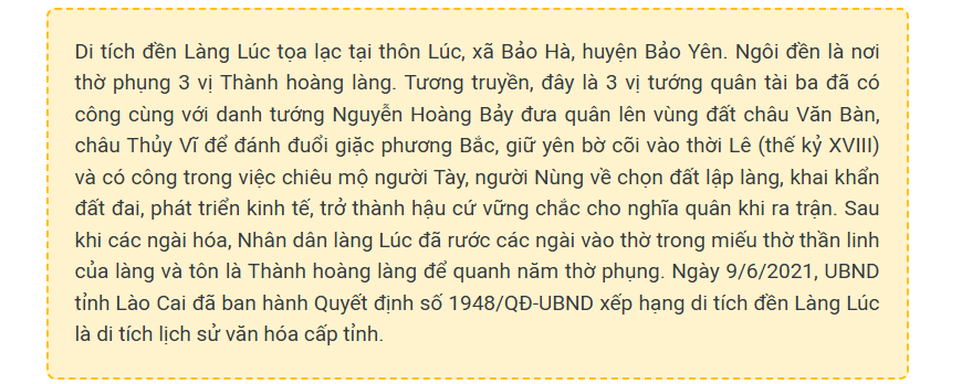 Ngày 4/2 (tức mùng 7 tháng Giêng), UBND xã Bảo Hà (huyện Bảo Yên) phối hợp với Ban Quản lý di tích và Phát triển du lịch huyện Bảo Yên tổ chức Lễ hội đền Làng Lúc xuân Ất Tỵ 2025.