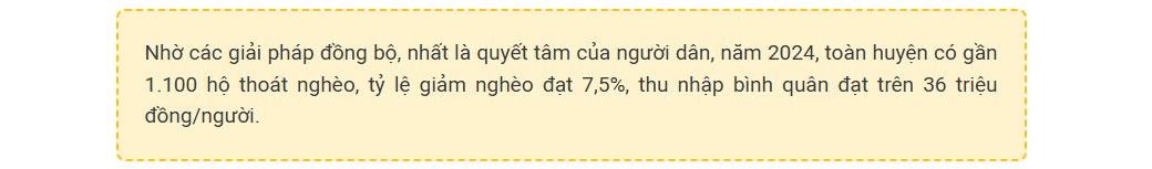 Cấp ủy đảng, chính quyền địa phương quan tâm tạo điều kiện thuận lợi hỗ trợ người dân vay vốn sản xuất. Năm 2024, toàn huyện có hơn 2.700 lượt hộ nghèo, cận nghèo, gia đình chính sách được vay vốn ưu đãi, tổng dư nợ trên 204 tỷ đồng.
