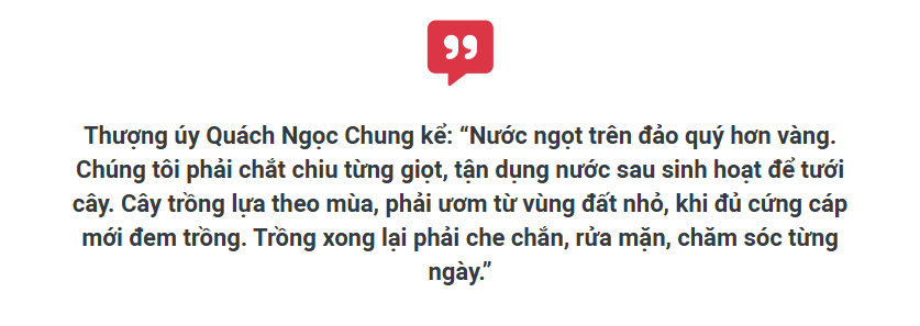 Dưới bàn tay chăm chút và sự sáng tạo của những người lính, đất không phụ công người. Giờ đây, dưới những tán bàng vuông rợp bóng, những giàn bí trĩu quả, những luống rau xanh mướt hiện diện như một kỳ tích. Nếu trước đây, đảo phải phụ thuộc hoàn toàn vào nguồn rau xanh cung cấp từ đất liền, thì nay đã tự túc được với đủ loại rau, củ, quả ,như: bầu, bí, mướp, cải, rau muống… Tổng sản lượng tăng gia hằng năm đạt gần 200 triệu đồng, góp phần cải thiện đáng kể đời sống của cán bộ, chiến sĩ.