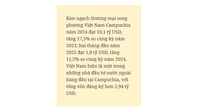Kim ngạch thương mại song phương năm 2024 đạt 10,1 tỷ USD, tăng 17,5% so cùng kỳ năm 2023; hai tháng đầu năm 2025 đạt 1,8 tỷ USD, tăng 11,2% so cùng kỳ năm 2024. Việt Nam hiện là một trong những nhà đầu tư nước ngoài hàng đầu tại Campuchia, với tổng vốn đăng ký hơn 2,94 tỷ USD.