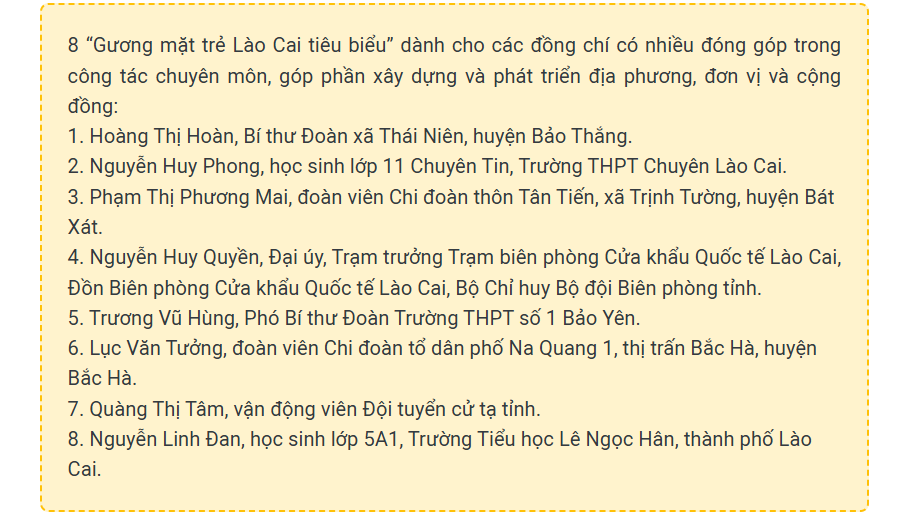Dịp này, Ban Thường vụ Tỉnh đoàn trao tặng danh hiệu “Đảng viên trẻ tiêu biểu học tập và làm theo Bác” cho 13 đồng chí; tuyên dương 8 “Gương mặt trẻ Lào Cai tiêu biểu” dành cho các đồng chí có nhiều đóng góp trong công tác chuyên môn, góp phần xây dựng và phát triển địa phương, đơn vị và cộng đồng (ảnh dưới).
