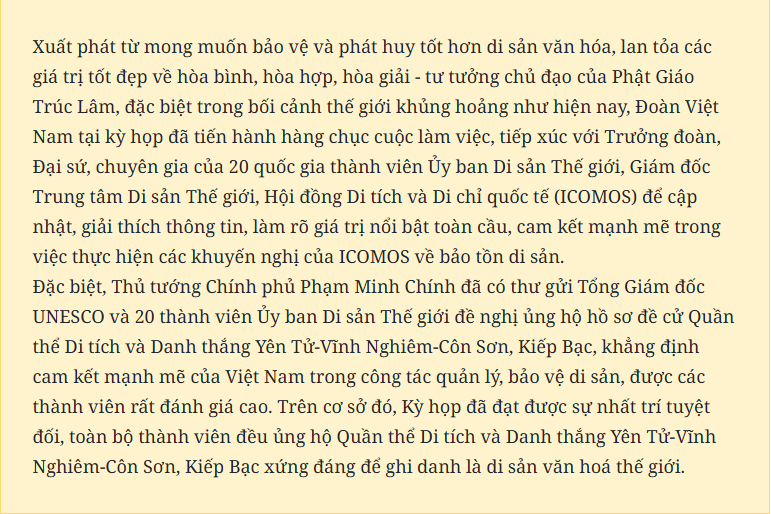 Đây cũng là một đóng góp nữa của Việt Nam cho mục tiêu bảo tồn và phát huy các giá trị di sản mà UNESCO đang thúc đẩy. Niềm vinh dự, tự hào luôn đi cùng với trách nhiệm, đòi hỏi các cấp, các ngành, các địa phương cần nâng cao nhận thức, triển khai đồng bộ các biện pháp thiết thực và hiệu quả bảo tồn và phát huy giá trị của di sản theo đúng tinh thần Công ước Di sản thế giới gắn với phát triển bền vững.