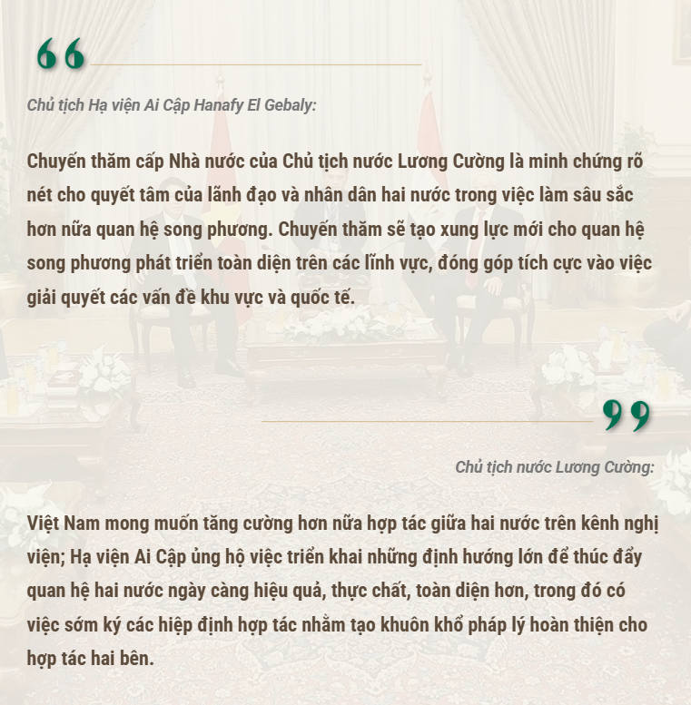 Chủ tịch nước Lương Cường nhắc lại những tình cảm yêu mến mà Chủ tịch Hồ Chí Minh và nhân dân Việt Nam dành cho Ai Cập, khẳng định sự trân trọng của Việt Nam đối với mối quan hệ song phương giữa hai nước được Chủ tịch Hồ Chí Minh, Tổng thống Gamal Abdel Nasser và các thế hệ lãnh đạo, nhân dân hai nước dày công vun đắp từ những ngày đầu đấu tranh giải phóng dân tộc.