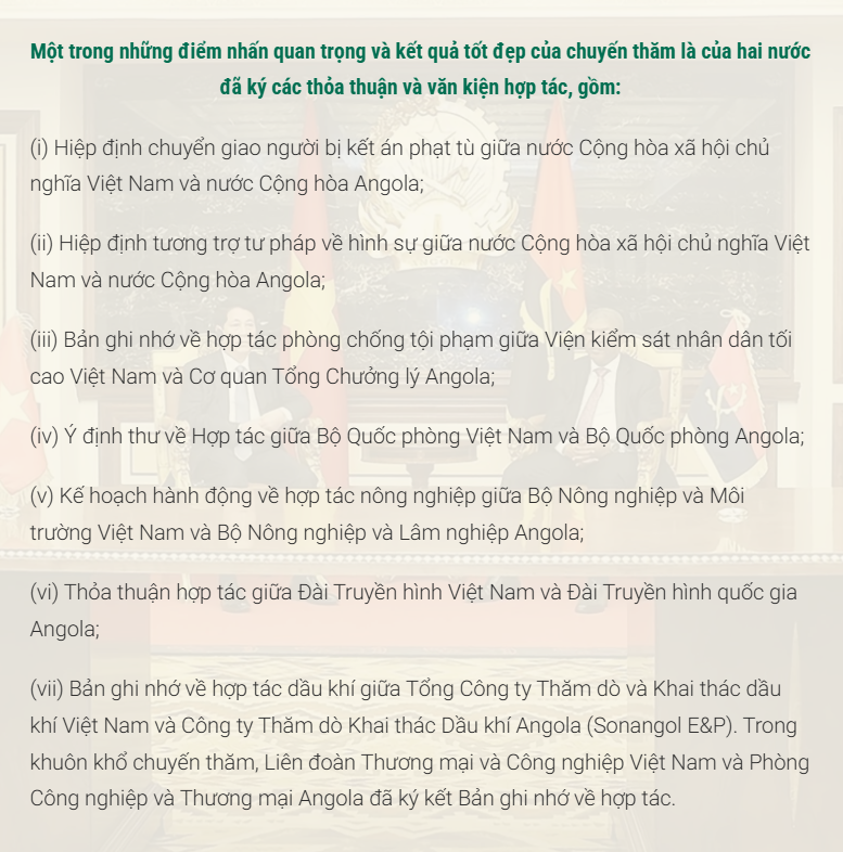 Chuyến thăm cấp Nhà nước đến Angola lần này một lần nữa khẳng định mạnh mẽ sự coi trọng của Việt Nam trong quan hệ với Angola; mong muốn đưa quan hệ Việt Nam-Angola bước vào một giai đoạn mới sâu sắc hơn về chính trị, mạnh mẽ hơn về kinh tế, rộng mở hơn về giao lưu nhân dân; mong muốn đưa quan hệ với Angola, một đối tác tin cậy hàng đầu của Việt Nam ở châu Phi, trở thành hình mẫu để thúc đẩy hơn nữa quan hệ hợp tác nhiều mặt giữa Việt Nam với các nước châu Phi anh em.