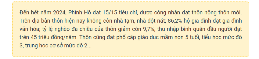 Từ thôn nghèo, Phình Hồ đã khoác lên mình diện mạo mới, tràn đầy sức sống niềm tin và hy vọng. Điều này không chỉ thể hiện ở những con số, những hạng mục công trình mà còn là những nụ cười rạng rỡ, sự văn minh, tiến bộ ở mỗi người dân nơi đây.