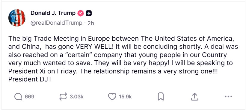Trong thông điệp đăng trên mạng xã hội Truth Social, ông Trump nói vòng đàm phán thương mại tại Madrid diễn ra rất tốt đẹp và ám chỉ việc đã đạt thỏa thuận về “một công ty được giới trẻ tại Mỹ rất muốn giữ lại”.