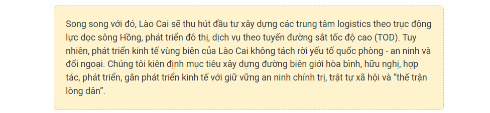 Lợi thế vùng biên không chỉ đem lại cơ hội về thương mại, logistics hay du lịch, mà còn khẳng định vai trò của Lào Cai là cửa ngõ hội nhập quốc tế của cả nước, trung tâm giao thương giữa Việt Nam - ASEAN - Trung Quốc, tiến tới mở rộng sang châu Âu. Đây sẽ là động lực quan trọng để Lào Cai phát triển nhanh, bền vững và khẳng định vị thế cực tăng trưởng của Vùng.