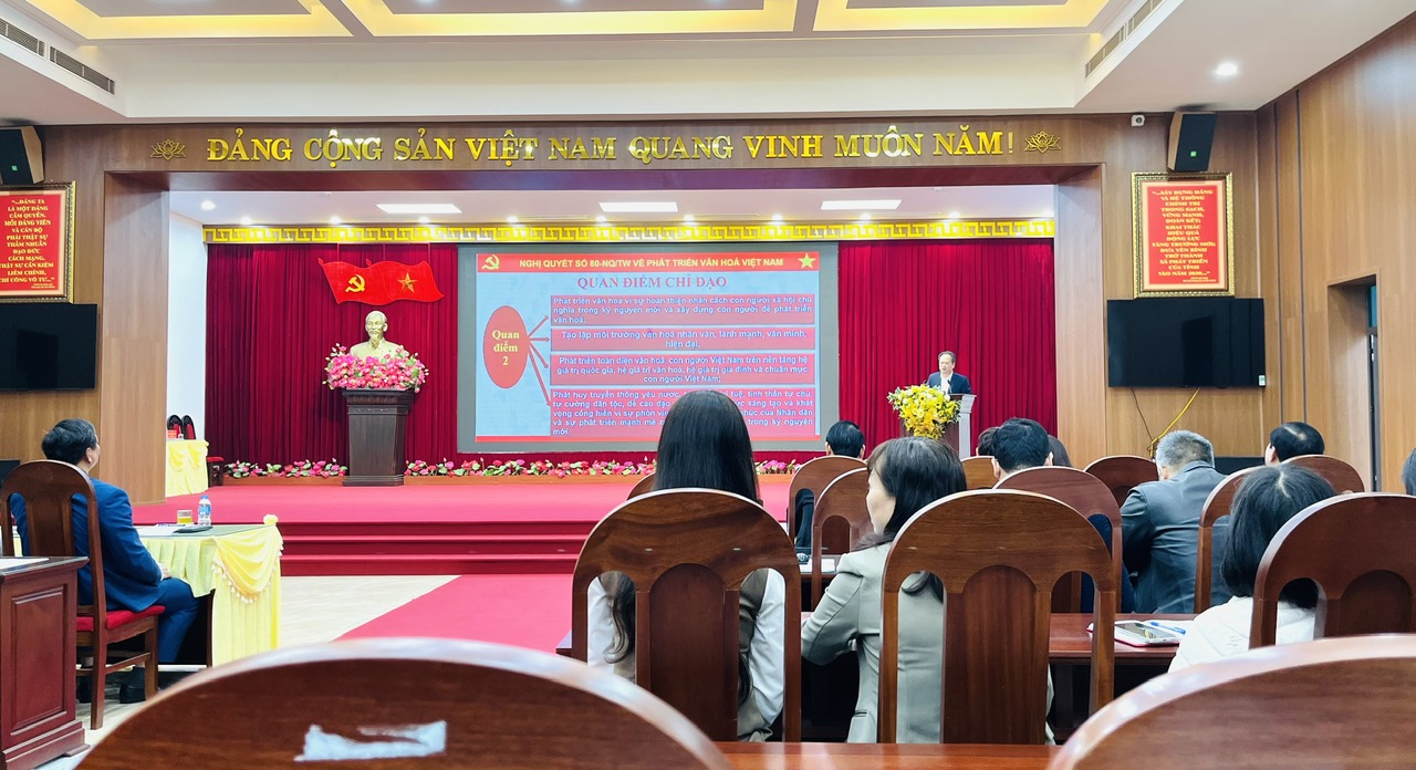 Đồng chí Lại Vũ Hiệp - Phó Giám đốc Sở Văn hóa, Thể thao và Du lịch truyền đạt những nội dung cốt lõi của Nghị quyết số 80-NQ/TW của Bộ Chính trị về phát triển văn hóa Việt Nam.