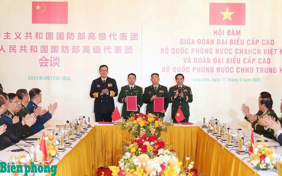Đại tướng Phan Văn Giang, Bộ trưởng Bộ Quốc phòng Việt Nam và Thượng tướng Đổng Quân, Bộ trưởng Bộ Quốc phòng Trung Quốc chứng kiến Đồn Biên phòng Cửa khẩu Quốc tế Hữu Nghị, Bộ đội Biên phòng tỉnh Lạng Sơn (Việt Nam) và Trạm hội ngộ hội đàm Bằng Tường, Bộ đội Biên phòng Khu tự trị dân tộc Choang Quảng Tây, (Trung Quốc) trao biên bản khung kết nghĩa trong Giao lưu lần thứ 9 (tháng 4/2025). Ảnh: Đơn vị cung cấp
