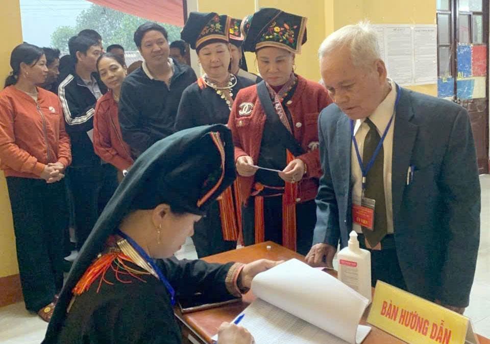 Cử tri nhận phiếu bầu cử tại Khu vực bỏ phiếu số 5, xã Mỏ Vàng