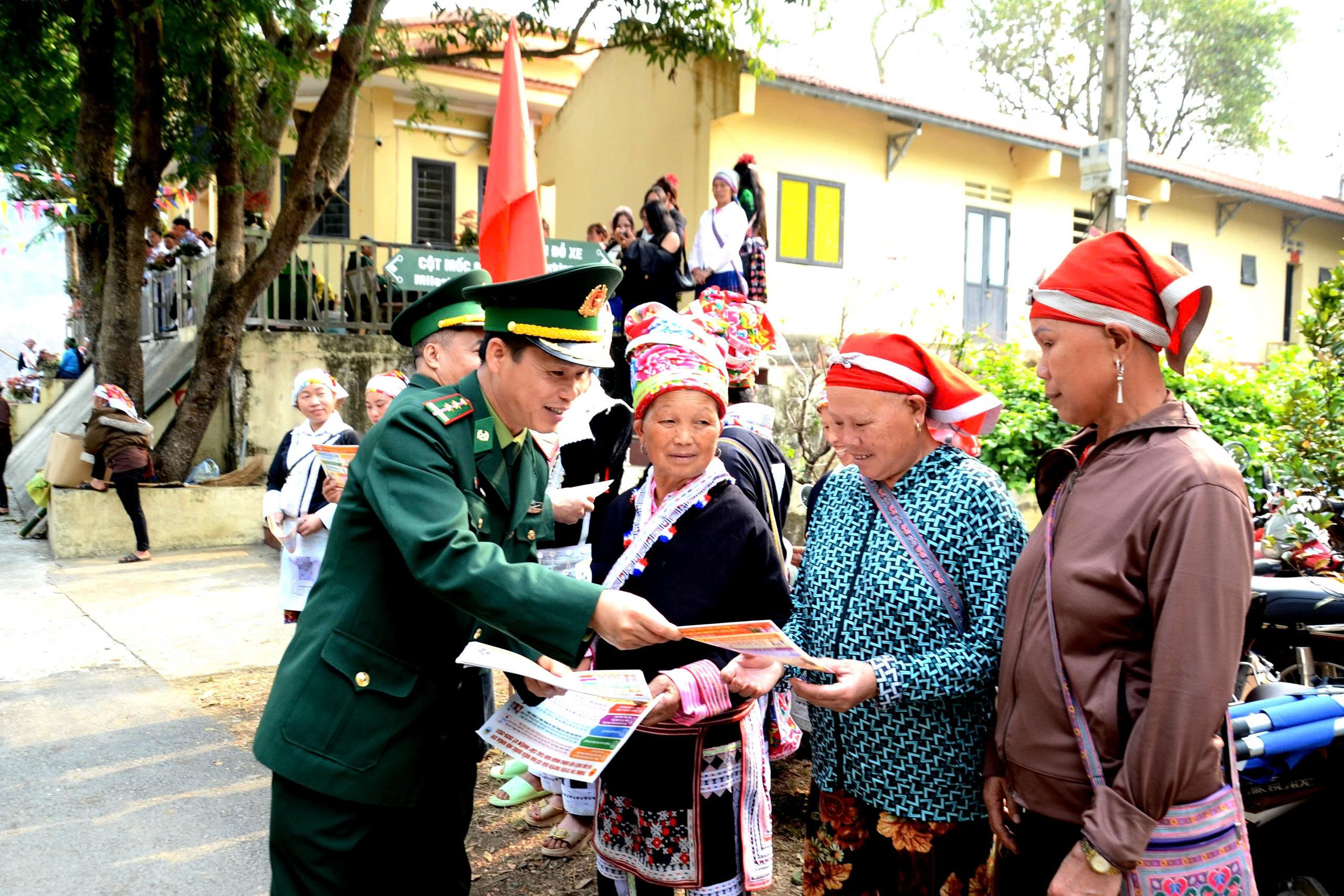Lực lượng chức năng hỗ trợ thông tin bầu cử đến đồng bào dân tộc thiểu số.