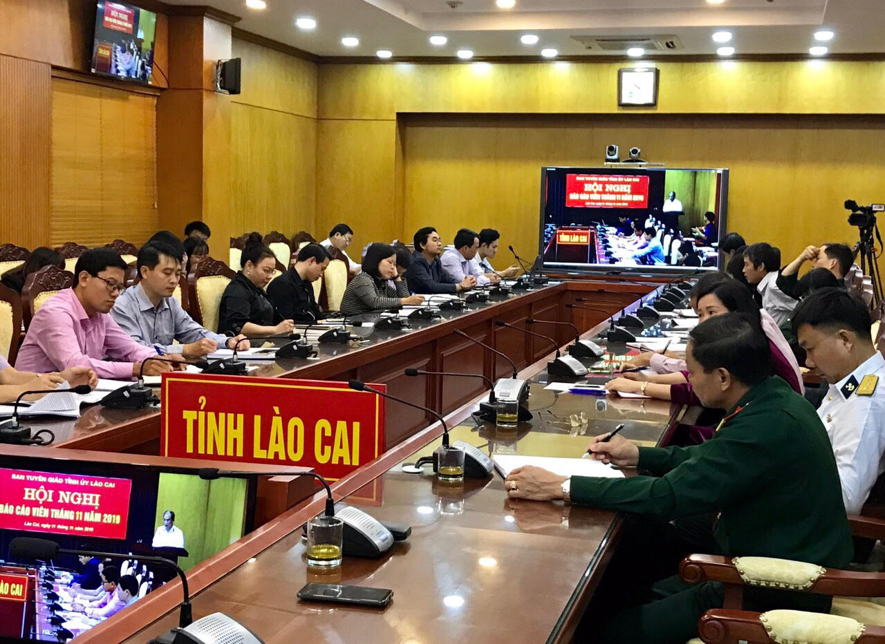 Sáng 11/11, tại phòng họp trực tuyến Tỉnh ủy Lào Cai, Ban Tuyên giáo Tỉnh ủy tổ chức Hội nghị báo cáo viên tháng 11/2019.Dự hội nghị có lãnh đạo Ban Tuyên giáo Tỉnh ủy; lãnh đạo các sở, ban, ngành trong khối tuyên giáo; lãnh đạo MTTQ và các đoàn thể chính trị - xã hội tỉnh; ban tuyên giáo các đảng ủy trực thuộc; lãnh đạo, giảng viên Trường Chính trị tỉnh và các trường chuyên nghiệp trên địa bàn.