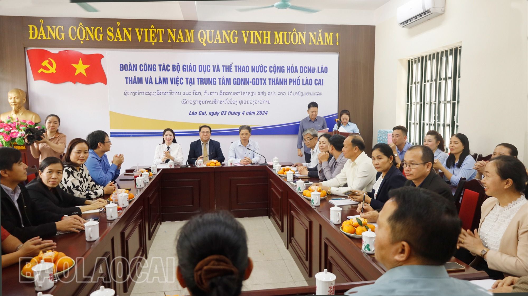Trưa 3/4, Đoàn công tác Bộ Giáo dục và Thể thao nước Cộng hòa dân chủ nhân dân (DCND) Lào do ông Seng Aloun Boutsady, Phó Vụ trưởng Vụ Giáo dục thường xuyên Lào đã đến thăm và làm việc tại Trung tâm Giáo dục nghề nghiệp - Giáo dục thường xuyên thành phố Lào Cai.