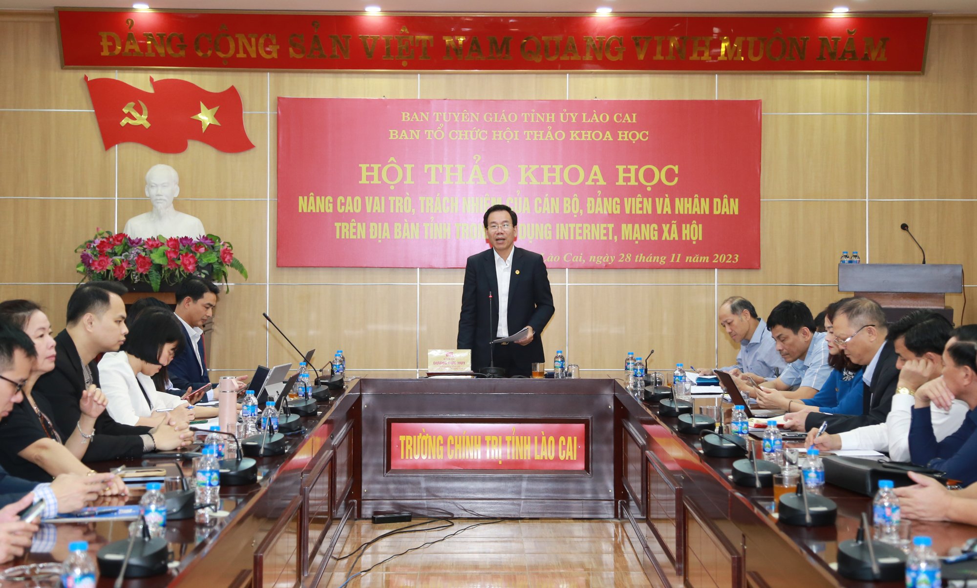 Sáng 28/11, Ban Tuyên giáo Tỉnh ủy tổ chức hội thảo khoa học “Nâng cao vai trò, trách nhiệm của cán bộ, đảng viên và Nhân dân trên địa bàn tỉnh trong sử dụng internet, mạng xã hội”. Đồng chí Dương Đức Huy, Ủy viên Ban Thường vụ, Trưởng Ban Tuyên giáo Tỉnh ủy chủ trì hội thảo.