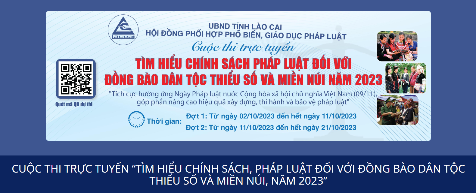 Với mục đích tăng cường tuyên truyền, phổ biến, giáo dục pháp luật và nâng cao nhận thức về pháp luật cho cán bộ, công chức, viên chức, Nhân dân và người lao động trên địa bàn tỉnh Lào Cai, từ 0 giờ ngày 12/10, đợt 2 Cuộc thi trực tuyến “Tìm hiểu chính sách, pháp luật đối với đồng bào dân tộc thiểu số và miền núi” năm 2023 chính thức diễn ra.