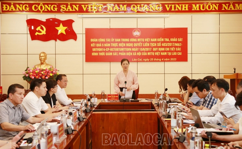 Sáng 25/4, Đoàn công tác Ủy ban Trung ương MTTQ Việt Nam kiểm tra, khảo sát kết quả 5 năm thực hiện Nghị quyết liên tịch số 403/2017/NQLT-UBTVQH14-CP-ĐCTUBTƯMTTQVN ngày 15/6/2017 quy định chi tiết các hình thức giám sát, phản biện xã hội của MTTQ Việt Nam tại Lào Cai.