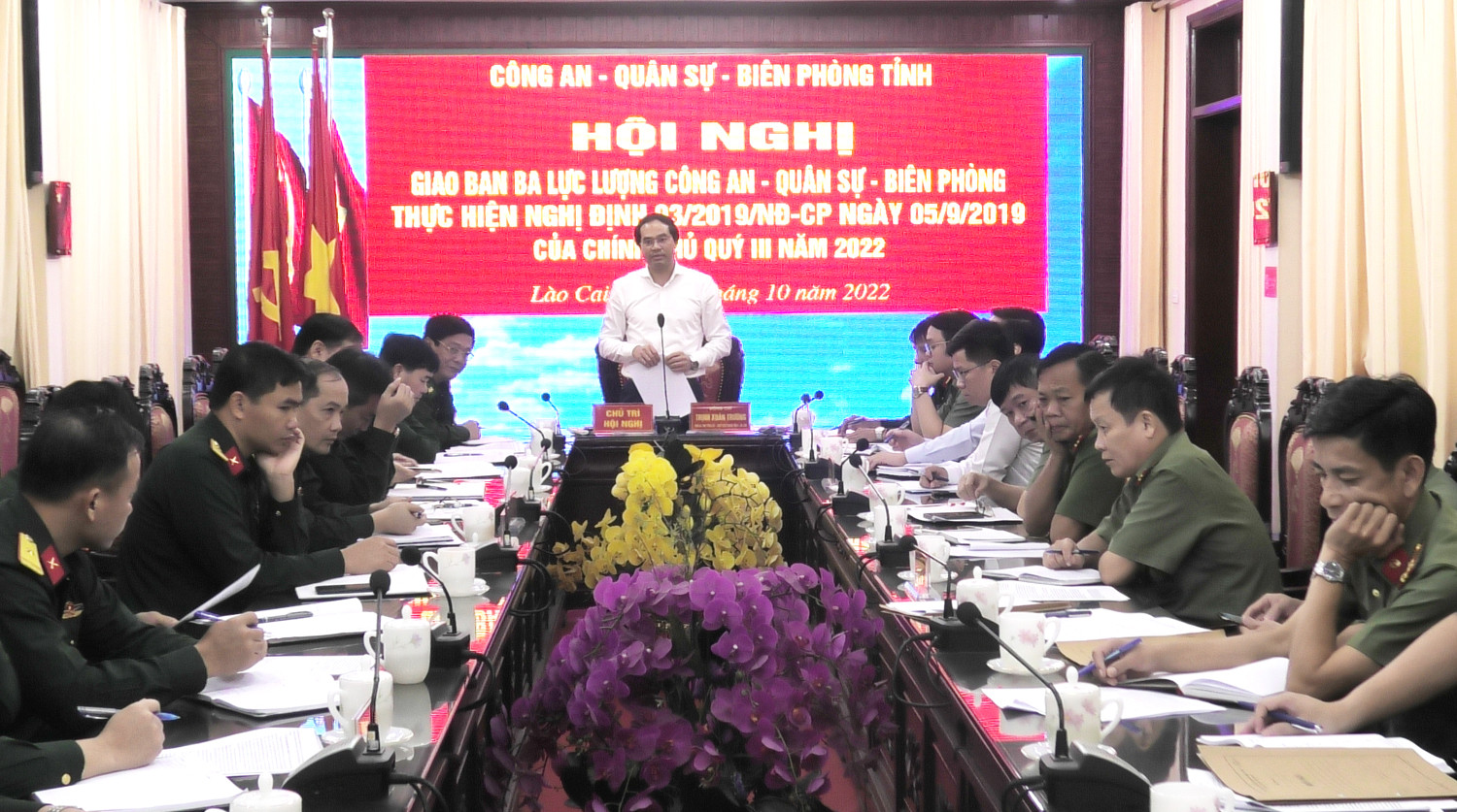 Chiều 25/10, tại Sở Chỉ huy Bộ đội Biên phòng tỉnh đã diễn ra Hội nghị giao ban 3 lực lượng công an, quân sự, biên phòng thực hiện Nghị định số 03/2019/NĐ-CP ngày 5/9/2019 của Chính phủ, quý III/2022.