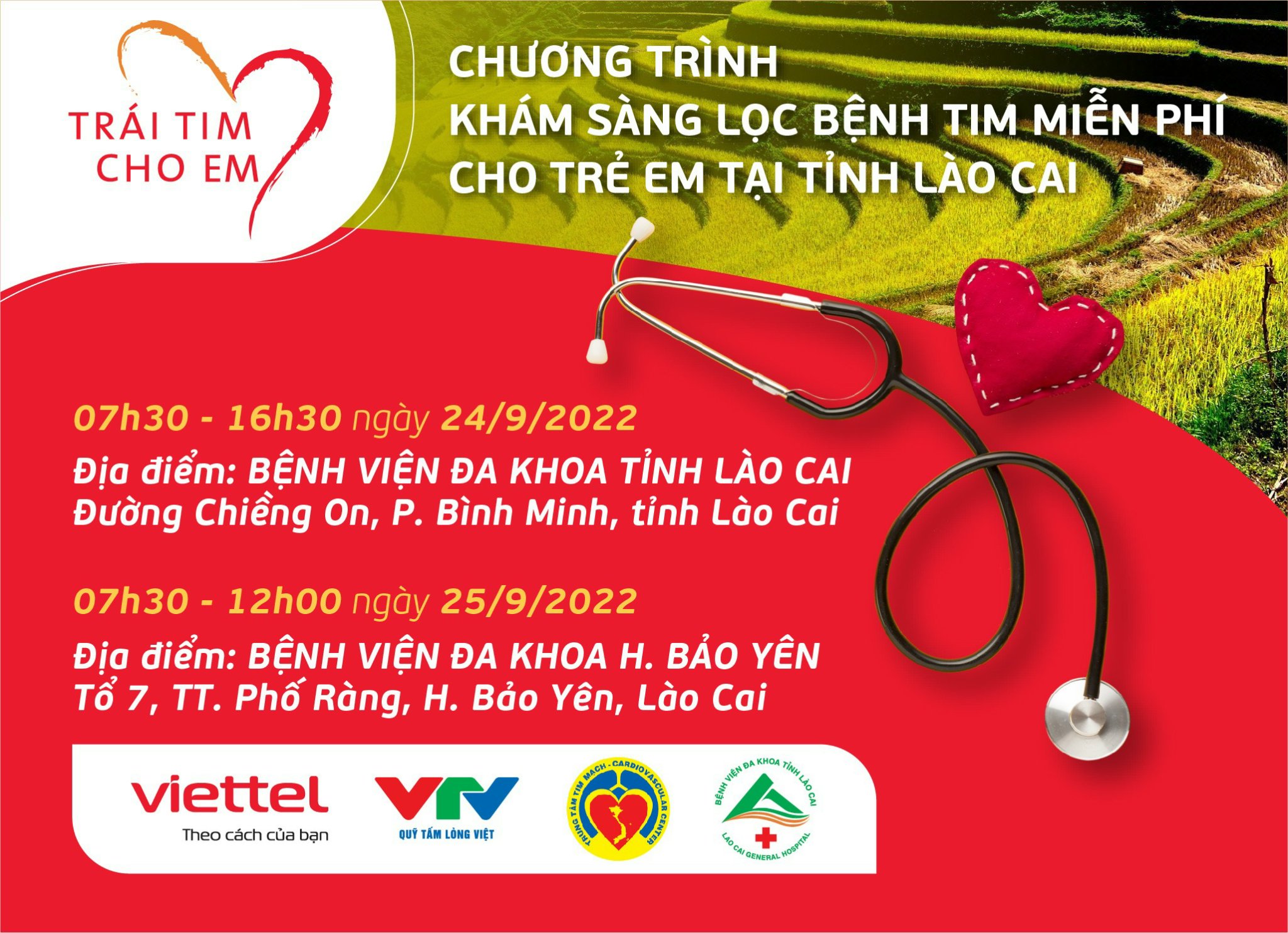 Chương trình khám sàng lọc miễn phí bệnh tim bẩm sinh của chương trình “Trái tim cho em” sẽ đến với trẻ em tỉnh Lào Cai trong ngày 24/9/2022 tại Bệnh viện Đa khoa tỉnh Lào Cai và ngày 25/9/2022 tại Bệnh viện Đa khoa huyện Bảo Yên.