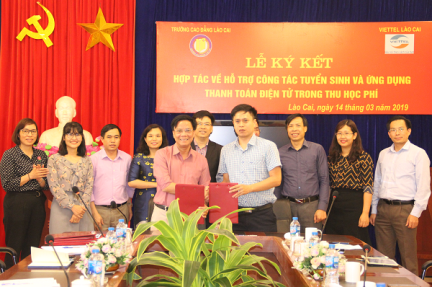 Chiều 14/3, Viettel Lào Cai và Trường Cao đẳng Lào Cai tiến hành ký kết hợp tác hỗ trợ công tác tuyển sinh và ứng dụng thanh toán điện tử trong thu học phí.