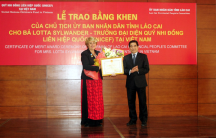 Chiều ngày 19/02, UBND tỉnh Lào Cai đã tổ chức Lễ trao tặng Bằng khen của Chủ tịch UBND tỉnh cho bà Lotta Sylwander – Trưởng Đại diện Quỹ Nhi đồng Liên hợp quốc (UNICEF) tại Việt Nam vì đã có nhiều đóng góp đối với công tác giáo dục - đào tạo và chăm sóc trẻ em tỉnh Lào Cai.