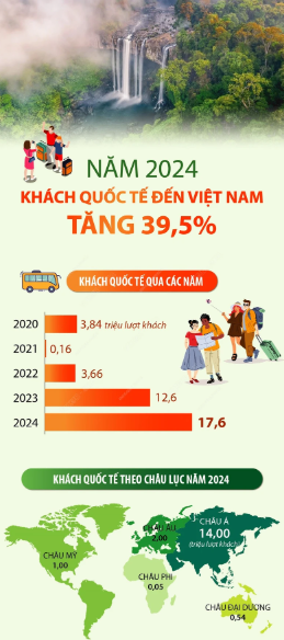 Tính chung năm 2024, khách quốc tế đến Việt Nam đạt gần 17,6 triệu lượt người, tăng 39,5% so với năm trước và gần bằng mức năm 2019 - năm chưa xảy ra dịch Covid-19.