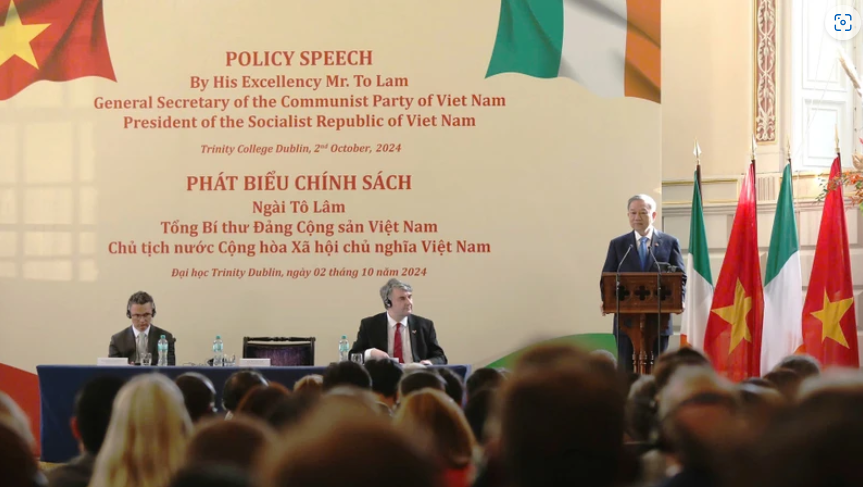 Trong khuôn khổ chuyến thăm cấp Nhà nước tới Ireland, chiều 2/10 (giờ địa phương), Tổng Bí thư, Chủ tịch nước Tô Lâm tới thăm và phát biểu chính sách tại Trường đại học Trinity Dublin. Báo Nhân Dân trân trọng giới thiệu toàn văn bài phát biểu của Tổng Bí thư, Chủ tịch nước.