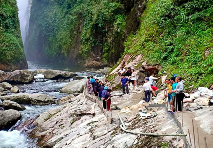 Để phục vụ khách du lịch, người dân thôn Trung Hồ, xã Trung Lèng Hồ đã họp bàn nhau góp tiền, công lao động làm đường vào thác Rồng.