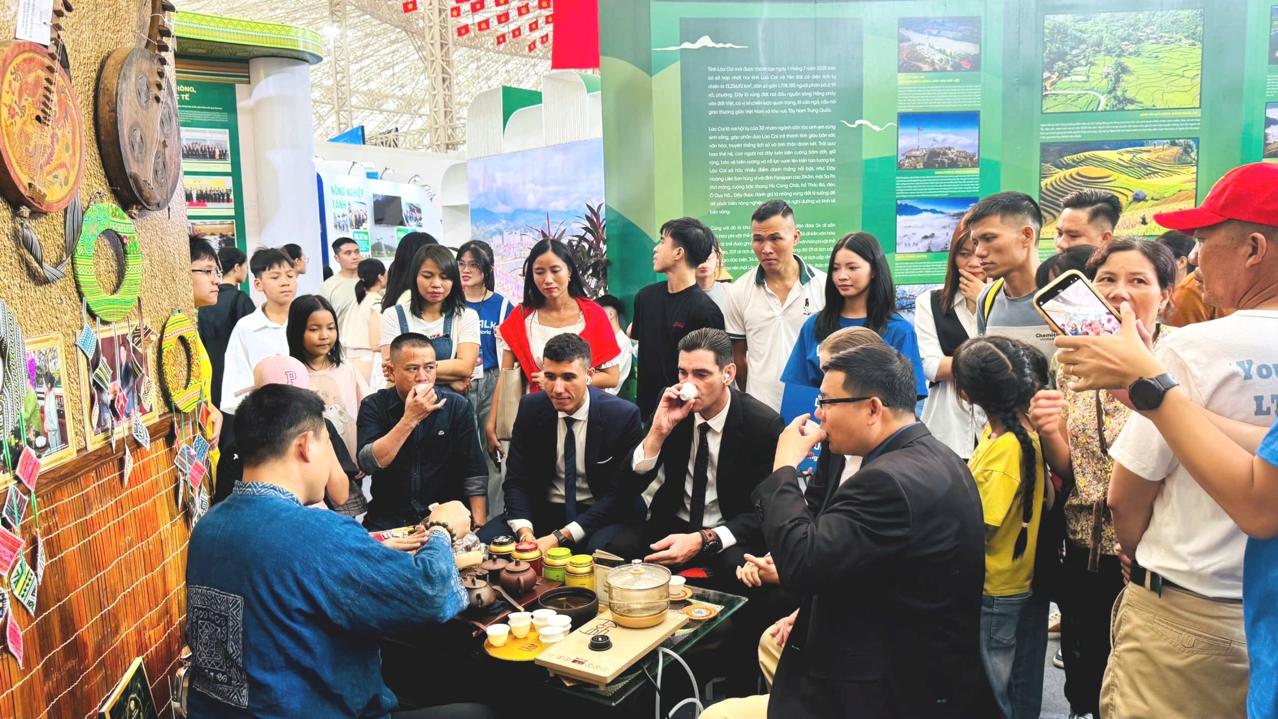 Giữa không gian nhộn nhịp của Triển lãm kỷ niệm 80 năm thành tựu đất nước, có một góc nhỏ khiến bước chân người qua dường như chậm lại. Hương trà Shan tuyết cổ thụ thanh khiết, ngọt dịu lan tỏa, níu giữ từng ánh nhìn, hơi thở. Đó là gian trưng bày của tỉnh Lào Cai - không chỉ là nơi giới thiệu sản vật, mà còn mở ra hành trình trải nghiệm bằng khứu giác và vị giác, đưa du khách như lạc vào Suối Giàng mờ sương.
