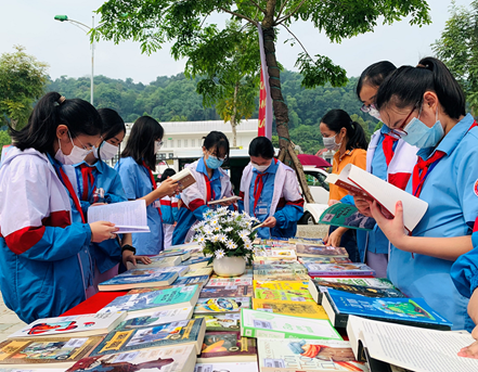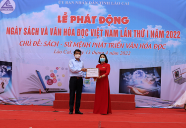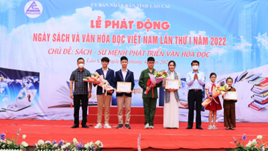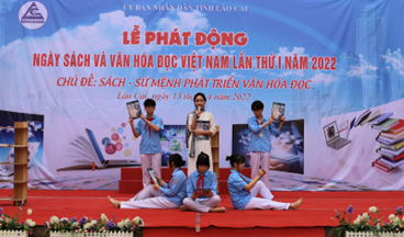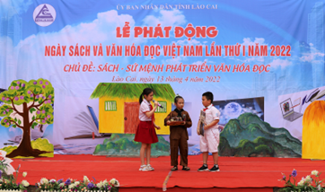 启动仪式上,来自3所学校(Nguyen Du 小学、黎贵敦中学、老街市第一中学)的学生参与了“介绍自己喜欢的书”的主题。以戏剧的形式,一群学生带到仪式上的每一本书都有助于传达关于故事内容的有意义的信息:爱祖国,爱国家,爱家人,养成每天看书的习惯。