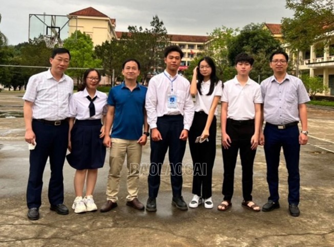 Two winning groups and teachers of the High School for the took photos with leaders of the Lao Cai Department of Education and Training.