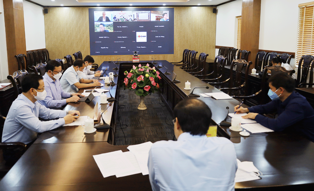 On the morning of March 23, Lao Cai Provincial People's Committee had an online meeting with EUBIZ Vietnam Joint Stock Company and advisors and experts on trade promotion.Attending the meeting at the bridge point of Lao Cai Provincial People's Committee were Mr. Trinh Xuan Truong, Deputy Secretary of the Provincial Party Committee, Chairman of the Provincial People's Committee; Hoang Quoc Khanh, Standing Vice Chairman of Provincial People's Committee; leaders of relevant departments and branches.
