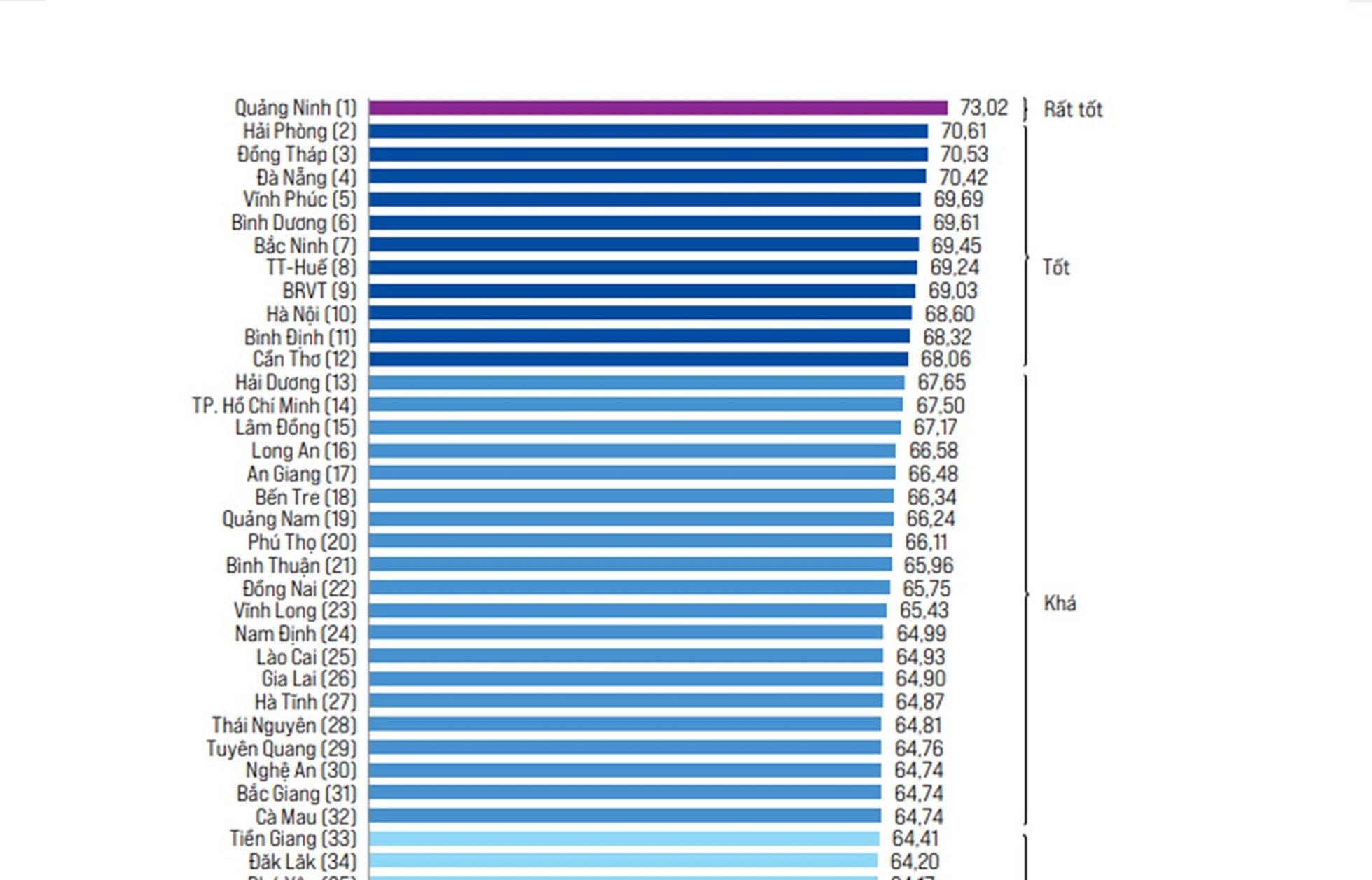 After Quang Ninh, the remaining positions in the top 10 PCI 2021 are respectively: Hai Phong (70.61 points); Dong Thap (70.53 points); Da Nang (70.42 points); Vinh Phuc (69.69 points); Binh Duong (69.61 points); Bac Ninh (69.45 points); Thua Thien Hue (69.24 points); Ba Ria - Vung Tau (69.03 points); Hanoi (68.6 points).