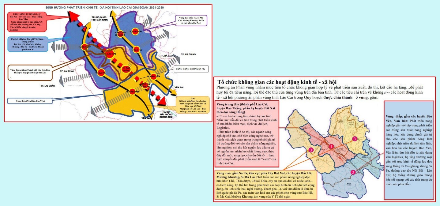 3 economic zones are: Lowland area including Van Ban and Bao Yen districts, focusing on developing commodity agricultural production areas, building value chains of agricultural and forestry products; developing spiritual and cultural tourism; attracting investment in the construction of logistics zones and commercial infrastructure associated with the dynamic economic axis along the Red River and Sa Pa airport, Noi Bai - Lao Cai expressway; developing industrial zones in the region. Upland areas including Bac Ha, Si Ma Cai, Muong Khuong districts, Sa Pa town, the western part of Bat Xat district develop temperate endemic agricultural products; developing various types of tourism with the focus on Sa Pa national tourism area, Bac Ha highland, Si Ma Cai, Muong Khuong, Bat Xat; implementing policies on social security, sustainable poverty reduction, stabilizing people's lives of all ethnic groups, and upholding national border sovereignty. The central area includes Lao Cai city, Bao Thang district, the lower part of Bat Xat district along the Red River, focusing on developing border gate economy, border trade, services, tourism, logistics, manufacturing industry, and high technology industrial processing, becoming an important link in the market value chain of agricultural and forestry products; a place to attract investment resources in both resources and high-quality human resources, promoting innovation, creativity, digital transformation, implementing the transformation of "green" economic development of Lao Cai province.