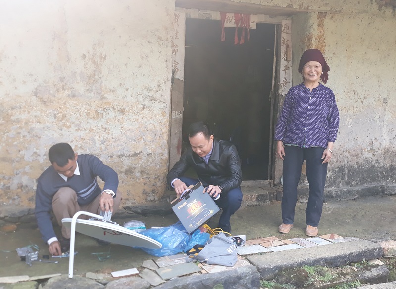 Theo chân 2 cán bộ kỹ thuật, chúng tôi đến tận hộ gia đình bà Lý Thị Kiều, dân tộc Dao tiền. Năm nay bà đã 64 tuổi. Tuy dáng người nhỏ bé nhưng những bước chân và các hoạt động vẫn rất nhanh nhẹn, hoạt bát. Mở cánh cổng nhỏ được làm bằng những nan tre nứa đã ngả màu thời gian, chúng tôi men theo những viên gạch rêu xanh xếp cạnh nhau trên nền đất gồ ghề tạo thành lối đi. Vào tới sân, bên hiên nhà nhỏ, người đàn ông chừng ngoài 70 tuổi, đầu đội mũ len đã ngồi đó chờ từ bao giờ. Thấy bà và chúng tôi bước vào, ông tỏ vẻ vui lắm. Bà bảo: “Ông nhà tôi mới bị tai biến, giờ mọi hoạt động đều rất khó khăn”. Sáng nay, ông dậy từ sớm và giục bà nhanh nhanh ra hội trường để thay ông nhận tivi.